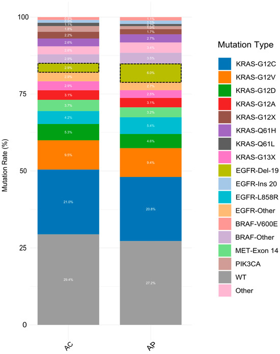 To investigate the correlation between molecular features and acinar pattern components, we compared the frequency of the most prevalent driver mutations between the two groups of AP and AC. Among the analyzed mutations, only the frequency of the EGFR-Del-19 mutation demonstrated a statistically significant difference between the two groups (p = 0.014) (Figure 2, Table 1).