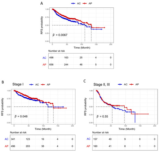 (A) RFS probability of all patients, and (B) RFS probability of stage I, and (C) Stage II, III. AP: acinar-predominant, AC: acinar component (non-acinar predominant LUAD with an acinar component of ≥5%), RFS: recurrence-free survival. Note: “p” represents the log-rank p-value, which was calculated through an unadjusted analysis (log-rank test). The dotted lines indicate the time (in months) at which the RFS probability reaches 0.5 for each group, representing the median RFS.