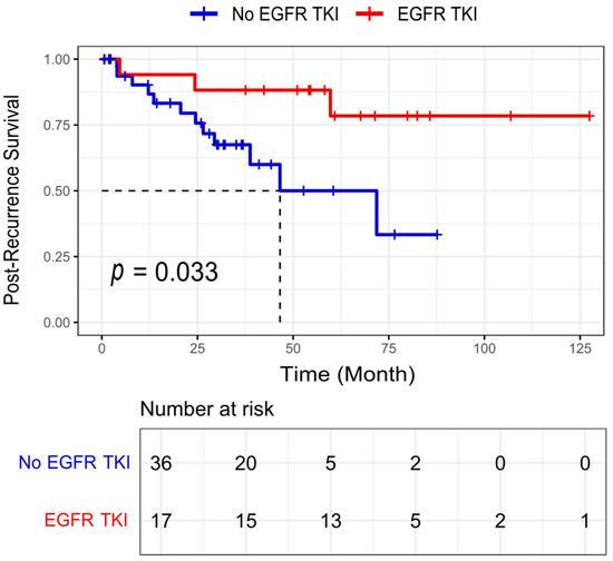 Post-recurrence survival of patients with EGFR-mutated lung adenocarcinoma harboring an acinar component of ≥5% according to the administration of EGFR tyrosine kinase inhibitors (TKI). Note: “p” represents the log-rank p-value, which was calculated via an unadjusted analysis (log-rank test). EGFR-TKI refers to cases that received EGFR-TKIs (gefitinib or erlotinib), while No EGFR-TKI refers to cases that did not receive these treatments. The dotted lines indicate the time (in months) at which the post-recurrence survival probability reaches 0.5 for each group, representing the median post-recurrence survival.