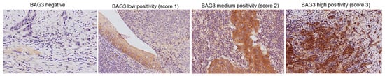 Representative images from different tumor localizations are displayed based on BAG3 immunoreactivity score (images were captured at 20× magnification).