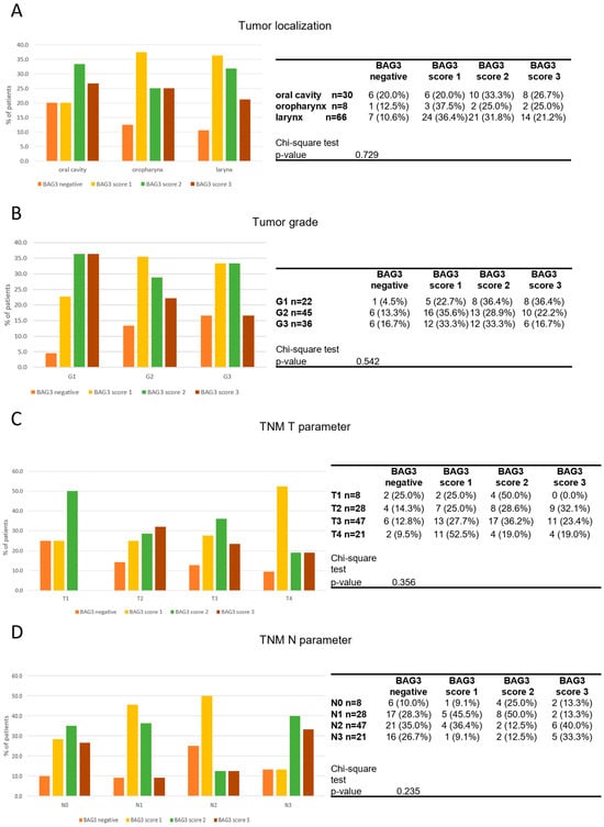 Distribution of BAG3 score obtained in tumor samples across tumor localization (A), tumor grade (B), TNM T parameter (C) and TNM N parameter (D). Groups were compared with appropriate contingency tables and by fisher’s exact test. The graphs and tables show the case numbers.