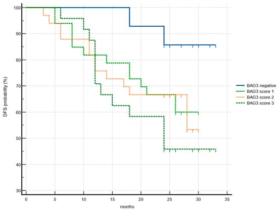 Association of disease-free survival (DFS) with BAG3 immunoreactivity. Kaplan–Meier plots DFS according to the groups of BAG3 negative (blue), BAG3 score 1 (light green), BAG3 score 2 (orange), BAG3 score 3 (dark green).
