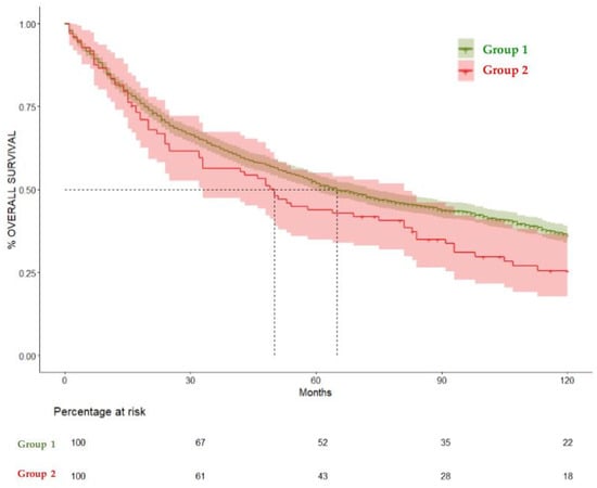 Kaplan–Meier curves comparing overall survival at 60 months in Group 1 and Group 2. HR = 1.23, (CI 95% 0.9–1.6) p = 0.14.