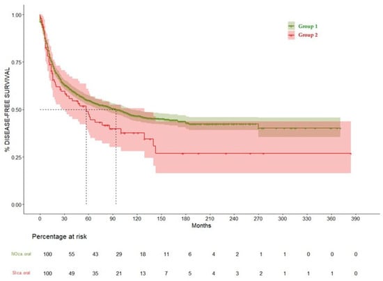 When analyzing disease-free survival (DFS), Group 1 showed median DFS of 94 months (CI 95% 73–112), while for Group 2 it was 57 months (CI 95% 31–129), showing a non-significant trend of higher incidence or oncological relapse among patients with history of OAOC (p = 0.06), as we can see in Table 4 and Figure 6.