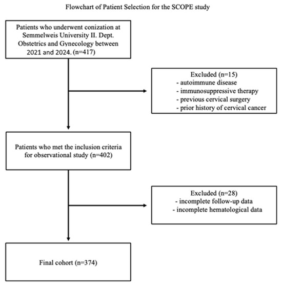 Patients who underwent conization at Semmelweis University II. Department of Obstetrics and Gynecology were initially screened (n = 417). Inclusion criteria required patients to have undergone conization for cervical dysplasia and have complete laboratory and clinical data. Patients were excluded if they had a history of autoimmune disease, immunosuppressive therapy, previous cervical surgery, prior cervical cancer diagnosis, or if follow-up or hematological data were incomplete. After applying these criteria, 374 patients were eligible for final analysis. Figure 1 illustrates the patient selection process.