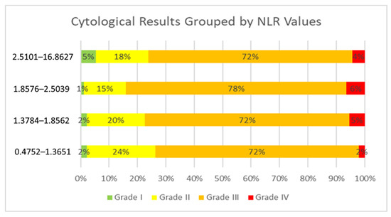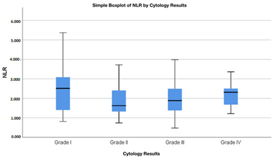This table presents the median neutrophil-to-lymphocyte ratio (NLR) values for different cytological outcomes. The table displays the median, range, minimum, and maximum values for cytology grade. The data indicate a trend of increasing NLR values with worsening cytological results.