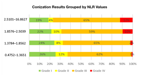 Distribution of Conization Results by NLR Categories Percentage distribution of conization results by histopathological grade is shown across different NLR levels. The x-axis represents the percentage of patients, while the color-coded bars indicate Grade I (green), Grade II (yellow), Grade III (orange), and Grade IV (red) conization findings. Higher NLR values are associated with more severe conization outcomes.