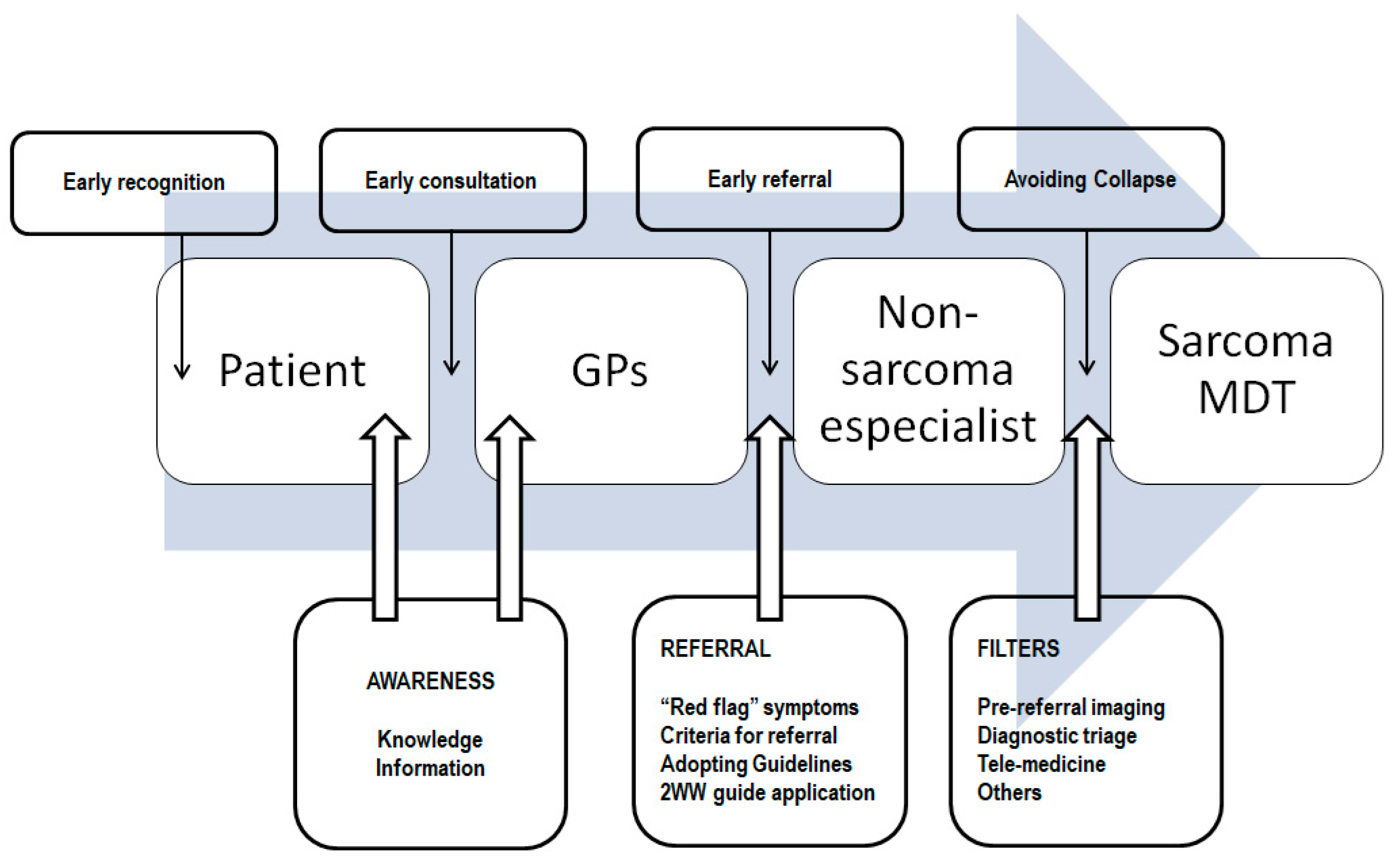 - Gerrand, C.; Francis, M.; Dennis, N.; Charman, J.; Lawrence, G.; Evans, T.; Grimer, R. Routes to diagnosis for sarcoma—Describing the sarcoma patient journey. Eur. J. Surg. Oncol. 2015, 41, 1393–1399. [Google Scholar] [CrossRef] [PubMed]