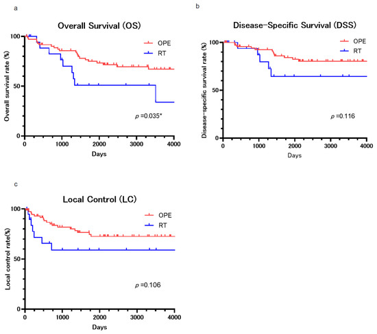 (a) The overall survival (OS) curve. All patients’ 5-year OS and 10-year OS rates were 70.2 and 61.2%. The 5-year OS was 74.9 and 51.0% for the surgery and RT groups, and the 10-year OS was 67.0 and 34.0% for the surgery and RT groups. (b) The disease-specific survival (DSS) curve. All patients’ 5-year DSS and 10-year DSS rates were 80.5 and 77.4%. The 5-year DSS was 86.0 and 64.5% for the surgery and RT groups, and the 10-year DSS was 80.5 and 64.5% for the surgery and RT groups. (c) The local control (LC) curve. The 5-year LC rates were 76.5 and 59.1% for the surgery and RT groups, respectively (Figure 1c). The 10-year LC rates were 72.6 and 59.1% for the surgery and RT groups, respectively. *: p < 0.05.