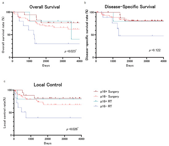 We then created Kaplan–Meier plots for the 83 cases, excluding the 11 cases in which p16 staining was impossible, and divided them into four groups according to p16 status and treatment. Although the DSS did not show significant differences, the OS and LC results showed significantly different behavior in the p16-negative RT treatment group compared to the other three groups (Figure 2a–c). The inferiority of RT over surgery in OS (Figure 1a) may be due to the fact that RT was performed on p16-negative OPSCCs.