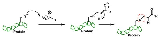 The Michael reaction with the thiolate group of Cys in proteins and enzymes.