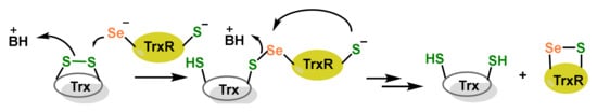 Catalytic activity of Sec in TrxR. BH+ represents the acid conjugate of the neutral base B. BH+ is the proton donor in the reaction.