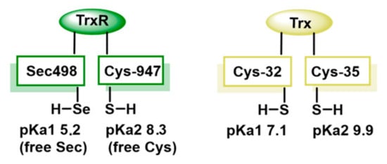 Sec, known as amino acid 21, is a unique selenium-containing amino acid, crucial for the catalytic activity of TrxR due to its high catalytic efficiency, resistance to oxidation and superior electrophilicity. Sec is a better nucleophile than Cys, enhancing TrxR’s efficiency, offering greater resistance to irreversible oxidation under OS conditions and accepting electrons more effectively, making it more efficient in redox reactions [16]. The pKa value of Cys and Sec are 8.3 and 5.2, respectively, implying that at physiological pH Sec is negatively charged as selenolate (Figure 2). Enzymes containing Sec in the active site are catalytically more efficient than Cys-containing counterparts [17].