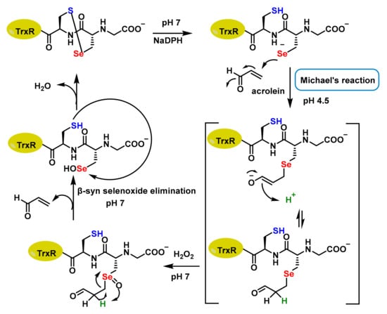 Acrolein interacts with TrxR by alkylating its Sec residue, but this can be reversed through β-syn selenoxide elimination. During this process, H2O2 oxidises the selenide to selenoxide, which abstracts the β-proton near the selenium atom. This β-selenoxide elimination restores TrxR to its oxidised selenosulphide state, renewing partially the TrxR activity. The quick elimination of the β-s selenoxide enables repair of the selenoenzyme, thanks to the C-Se bond’s lability [30] (Figure 4).