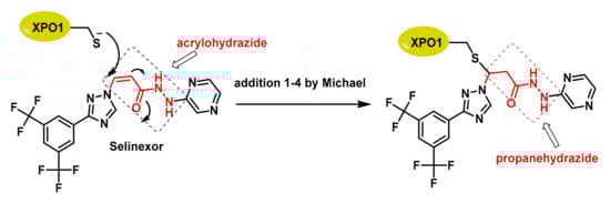 The acrylohydrazide (red) of Selinexor acts as a Michael acceptor, facing the Cys528 nucleophile of XPO-1. A propanehydrazide derivative (red) is formed and appears inside the compound box on the right.