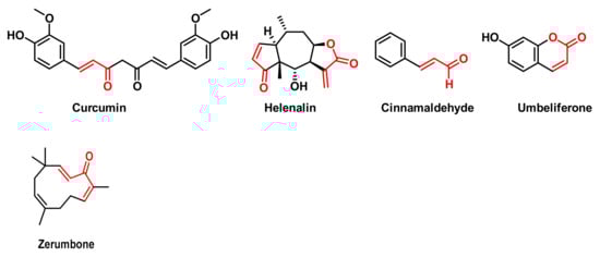 Structures of Curcumin, Helenalin, Cinnamaldehyde, Umbelliferone and Zerumbone.