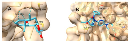 Cys497 and Sec498 are located at the C-terminal end of TrxR. Cys497 is located near helix 3, while Sec498 is close to helix 1 of the enzyme structure, creating a catalytic site where Trx is reduced [123]. Within the TrxR structure, the amino acids Cys497 and Sec498 form a unique redox centre. This C-terminal redox centre (Cys497/Sec498) is placed on the surface of the enzyme, allowing it to interact with its substrates, such as thioredoxin [124]