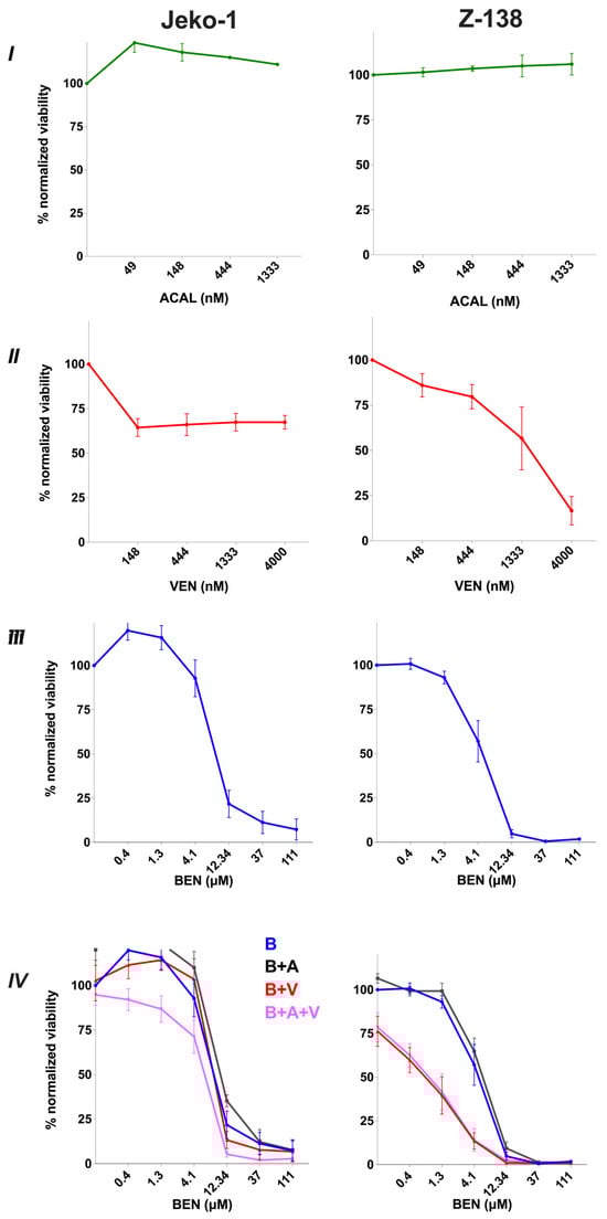 (I) Single-agent dose curves of Acalabrutinib (A), (II) Venetoclax (V) and (III) Bendamustine (B) on the human MCL cell lines Jeko-1 and Z-138. Here, 30,000 cells were treated with increasing concentrations of A, V or B alone for 72 h. (IV) Combination dose curves of A and/or V with B. Jeko-1 and Z-138 cells were incubated with increasing concentrations of B alone or in combination with a constant concentration of 1 μM of A, V or both A + V for 72 h. Normalized % viability was measured with the CellTiter 96 AQueous One Solution Cell Proliferation (MTS) assay. Data represent mean +/− S.E.M. from 4 independent experiments. nM = nanomolar; μM = micromolar.