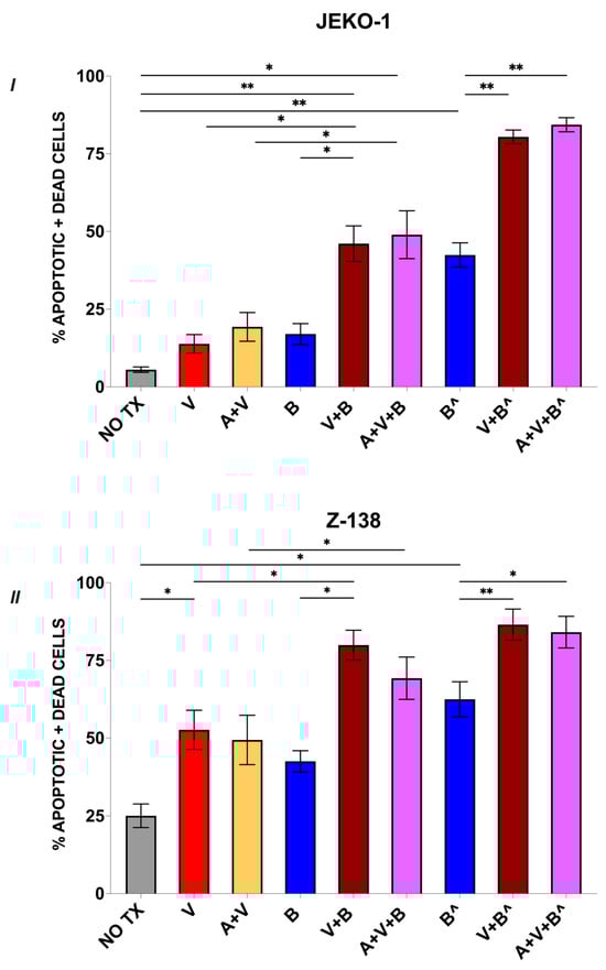 Bendamustine (BEN-B) combined with Venetoclax (VEN-V) +/− Acalabrutinib (ACAL-A) increases apoptosis and cell death. (I) Jeko-1 was treated for 24 h with different doses of BEN (B = 12.3 μM and B^ = 37 μM) alone or in combination with 1 μM of VEN, with or without ACAL 1 μM. (II) Z-138 cells were treated for 24 h with different doses of BEN (B = 1.3 μM or B^ = 4.1 μM) alone or in combination with 1 μM of VEN, with or without ACAL 1 μM. The percentage of dead and apoptotic cells was assessed with the use of Annexin V/Propidium Iodide staining. Data represent the mean +/− S.E.M. from 5 independent experiments. * p < 0.05, ** <0.01, μM = micromolar.
