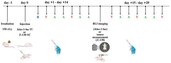 In vivo experimental layout for Jeko-1-Luc intravenous model and for Z-138 subcutaneous model. B = Bendamustine, A = Acalabrutinib, V = Venetoclax, SC = subcutaneous, IV = intravenous, BLI = bioluminescence imaging. Created in https://Biorender.com.