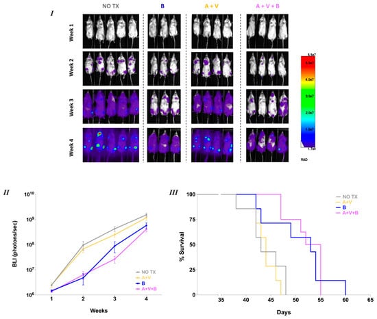 Oral B = Bendamustine inhibits tumor progression in NSG mice engrafted with Jeko-1-Luc. (I) BLI images from one representative experiment using Jeko-1-Luc at the indicated time points. A = Acalabrutinib, V = Venetoclax. (II) BLI data monitored once weekly following Jeko-1-luc inoculation. Data were analyzed using a mixed linear model with Tukey’s post-hoc test to assess the differences between the groups. p values: NO TX vs. AV = ns, B < 0.02, A + V + B < 0.02; A + V vs. B < 0.02, A + V + B < 0.02. (III) Kaplan–Meier survival curve of mice inoculated with Jeko-1-Luc that received vehicle controls (NO TX) (n = 7), A + V (n = 7), B (n = 7), A + V + B (n = 8). Data were pooled from 2 independent experiments. Comparison between groups was done using the log-rank test. p values: NO TX vs. A + V = ns, B < 0.02, A + V + B < 0.002; A + V vs. B < 0.02, A + V + B < 0.002; B vs. A + V + B = ns.