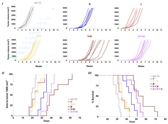 Combining Venetoclax (V) with oral Bendamustine (B), with or without Acalabrutinib (A), significantly suppresses Z-138 tumor progression in NSG mice. (I) Individual tumor measurements of Z-138 xenograft mice receiving vehicle control (NO TX) (n = 9), A + V (n = 9), V (n = 5), B (n = 7), A + V + B (n = 9) or V + B (n = 8). Mice were assessed twice weekly for tumor growth. Each time point represents the average of two weekly measurements. (II) Kaplan–Meier analysis of time to a tumor size of 1000 mm3. p values: NO TX vs. V = ns, A + V < 0.03, B, V + B, A + V + B < 0.0001; V vs. A + V = ns, B < 0.03, V + B < 0.0001, A + V + B < 0.002; A + V vs. B < 0.009, V + B < 0.0001, A + V + B < 0.001; B vs. V + B < 0.0005, A + V + B < 0.005; V + B vs. A + V + B = ns. (III) Survival of mice with subcutaneous Z-138 xenografts. Mice were euthanized when the tumor volume reached or exceeded 5000 mm3. p values: NO TX vs. V < 0.03, A + V < 0.0002, B, V + B, A + V + B < 0.0001; V vs. A + V = ns, B < 0.02, V + B < 0.0001, A + V + B < 0.0002; A + V vs. B < 0.007, V + B < 0.0001, A + V + B < 0.0001; B vs. V + B < 0.003, A + V + B < 0.04; V + B vs. A + V + B = ns. Data were pooled from 3 independent experiments. Comparisons between groups were performed using the log-rank test.