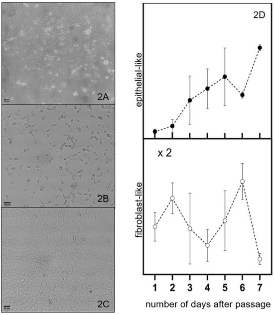 The Hs 895.T (ATCC® CRL7637™) line was found to be predominantly melanomas with the mesenchymal-like phenotype as received and used after a handful of passages, illustrated on Figure 2A. These cells are wide in the middle and become thinner towards the two ends. A mixture of cells with shapes similar yet not identical to the ones reported for epithelial- or mesenchymal-like phenotypes cells was observed after about forty (40) passages from the initial seed of the received cell line, as illustrated on Figure 2B. We refer to these cells as having a cuboidal-like or fibroblast-like morphology. This trend can also be observed in new cell cultures that are grown after several freeze–thaw cycles. Cell cultures close to maximum confluence have a cuboidal-like morphology, as illustrated in Figure 2C.