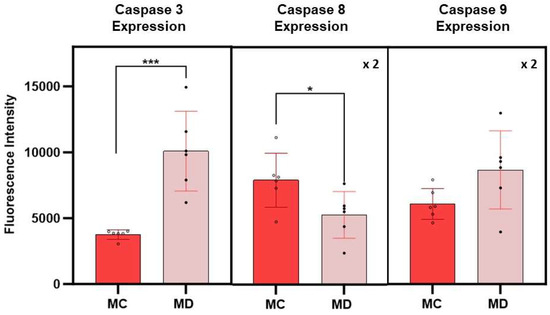Average fluorescence intensities corresponding to caspases 3, 8, and 9 expressions in melanoma cells with epithelial-like phenotype at 24 h post treatment with the dispersion D. MC and MD represent melanoma control and melanoma dispersion, respectively. Error bars represent the standard error. The fluorescence intensity of caspases 8 and 9 was multiplied by a factor of 2 for purposes of using the same scale for all measurements. The symbols * and *** indicate a significant difference in p-values between MC and MD (the number of * characters correspond to the decimal places in reported values.