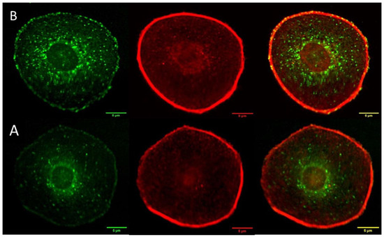 Digital confocal fluorescence microscopy at 60× magnification of vinculin (green), actin cytoskeleton (red) and focal adhesion (composite of vinculin and actin expression) in Hs 895.T (ATCC® CRL7637™) cells in (A) control and (B) 24 h post treatment. Focal adhesions were detected using an anti-vinculin monoclonal antibody and an FITC-conjugated secondary antibody; actin was detected using TRITC conjugated Phalloidin. The delocalization of vinculin in the cytoplasm is taken as evidence of FAK regulation in post-treatment malignant cells. Focal adhesion points localized on the interphase with the ECM increase, as evidenced by the bright spots on the cell membrane. Scale bar is 5 µm.