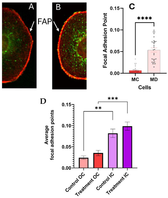 The dispersion increases the number of bright focal adhesion points (FAP) at the cell membrane–ECM interphase in melanoma cells 24 h post treatment, as summarized in (A–C) (p < 0.0001). The FAP close to the nuclei (IC) and at a distance of a 1.75 times the nuclear ratio (OC) are statistically unchanged in the control and treated melanoma cells, as summarized in (D). The error bars in the graphs represent the standard error of measurements within a 95% confidence limit. The number of asterisks (*) corresponds to the level of significance and number of decimal places in the p-value.