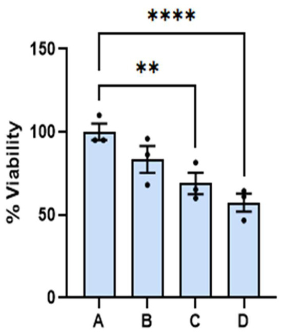 The 24 h viability of melanoma cells with mesenchymal phenotypes as a function of the percentage (%) of dispersion used. Error bars represent the standard error with confidence level of 95%. The (**) and (****) represent p values < 0.01 and <0.0001, respectively.