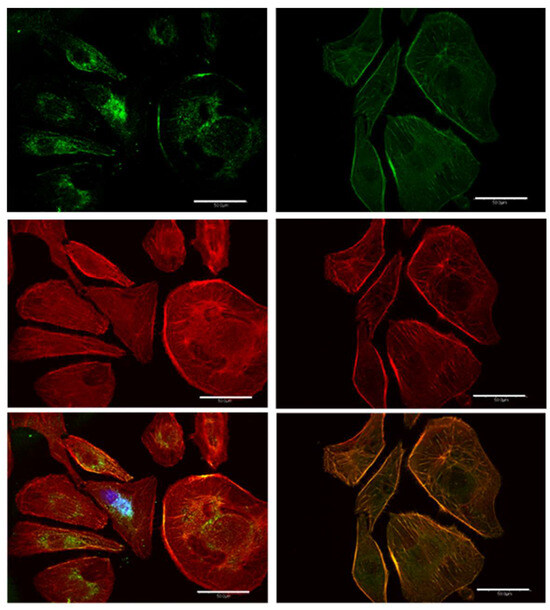The dispersion facilitates the regulation of relevant proteins associated with FAP. Digital confocal fluorescence microscopy at 60× magnification of vinculin (green) and actin (red) expression in Hs 895.T (ATCC® CRL7637™) melanoma with a predominantly mesenchymal phenotype. The images corresponding to the control and 24 h post treatment are indicated at the left- and righthand sides of the figure, respectively. The delocalization of vinculin in the cytoplasm is taken as evidence of FAK regulation in post-treatment malignant cells. The indicated bar length corresponds to 50 μm.
