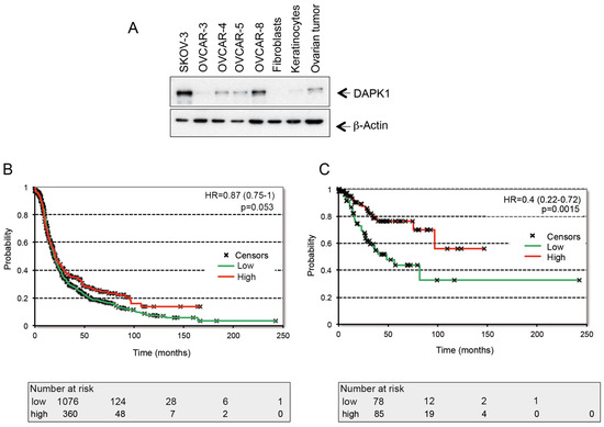 DAPK1 expression in high-grade serous ovarian cancer (HGSOC) cells and its prognostic role. (A) Expression analysis of DAPK1 in ovarian cancer cell lines and primary cells by Western Blot (WB). Cell lysates were immunoblotted for DAPK1 and β-Actin. For all panels, one image representative of three independent experiments is shown. (B) Patients were divided into groups with low and high levels of DAPK mRNA expression based on the best cutoff option. Using the Kaplan–Meier plotter database, survival curves for progression-free survival for (B) stages I–IV and (C) early stage I + II tumors of patients with OC treated with debulking surgery and CT are shown. Every graphic has log-rank p-values, the hazard ratio (HR), and 95% confidence intervals. (The uncropped blots are shown in Figure S4/Figure 1A).