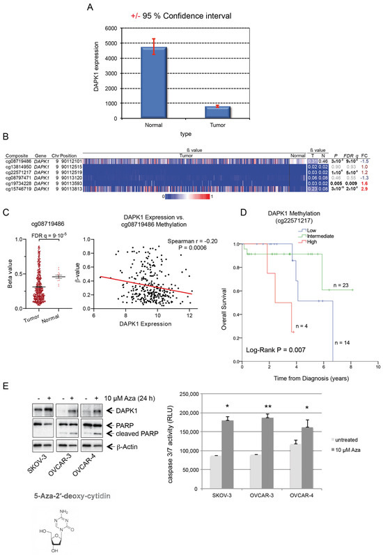 Epigenetic regulation of DAPK1 expression. (A) RNAseq-based expression of DAPK1 shows lower expression in ovarian cancer patients (n = 374) compared to normal tissues (n = 133). Mann–Whitney U-test p < 1 × 10−16. (B) Methylation status at the DAPK1 promoter for 600 tumors compared to 12 normal samples from OV-TCGA. FC, fold change. (C) Comparison of the Beta values for the tumor and normal samples and their inverse correlation to DAPK1 gene expression. (D) Kaplan–Meier survival curves of OV-TCGA patients with low-stage (I and II) disease, showing high methylation (4th quartile, red) in the DAPK1 promoter at cg22571217, are significantly associated with poorer overall survival. The first quartile is depicted in blue, whereas the second and third quartiles are shown combined in green. (E) Ovarian cancer cell lines were treated with 10 µM of 5-Azacytidine for 24 h. Cell lysates were immunoblotted for DAPK1, PARP, and β-Actin (upper left panel). The chemical structure of 5-Azacytidine (Aza) is shown (lower left panel). A Caspase-Glo 3/7 assay was used to measure the Aza-dependent Caspase-3/7 activity (right panel). p < 0.05 for *; p < 0.01 for **. Student’s two-tailed, unpaired t-test. (The uncropped blots are shown in Figure S4/Figure 2C).