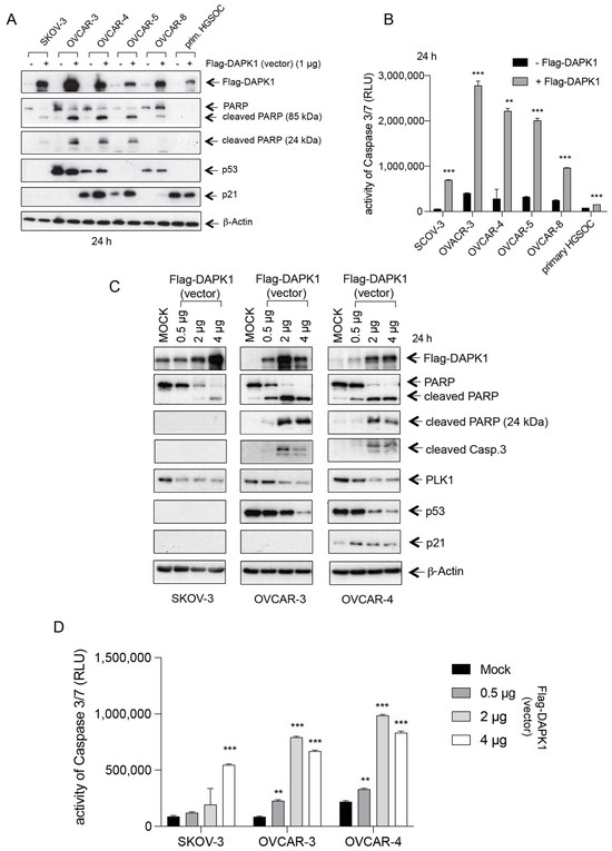 Considering the upregulated promoter methylation of DAPK1 and its prognostic power in the early stages of the disease, we wondered whether DAPK1 reactivation might have anti-proliferative potential in ovarian cancer. To this end, we evaluated the effects of the re-expression of wild-type (wt), full-length, Flag-tagged DAPK1 on cell viability using high-grade and non-high-grade ovarian cancer cell lines. Reduced cell viability, as measured by PARP cleavage in cell lines and increased Caspase 3/7 activity in cell lines and primary tumor cells, was observed upon the mammalian vector-based expression of DAPK1 (Figure 3A,B). The induction of apoptosis, as indicated by the cleavage of PARP and Caspase-3, was concentration-dependent, whereas a control vector was ineffective (Figure 3C,D). The expression of PLK1, a key regulator of cell cycle progression and a marker of cellular proliferation [18,19,20,21,22,23], was inversely correlated with the vector-prone increase in DAPK1 re-expression (Figure 3C), supporting an anti-proliferative role of DAPK1 in ovarian cancer. Cell lines expressing the classical p53 target gene, p21 [24,25], exhibited increased p21 levels upon DAPK1 expression compared to mock-transfected cells (Figure 3A,C). With rising levels of apoptosis, the level of p21 began to decrease (Figure 3C). The vector-based rescue of DAPK1 expression in the HGSOC cells, OVCAR-3 and OVCAR-8, induced the upregulation of p14ARF expression, consistent with the role of DAPK1 in promoting the expression of p14ARF [11] (Figure 3C). In addition, we observed increased myosin regulatory light chain-2 (MLC-2) phosphorylation, a direct target of DAPK1, indicating that the vector-based restoration of DAPK1 retains full activity (Figure 3C).