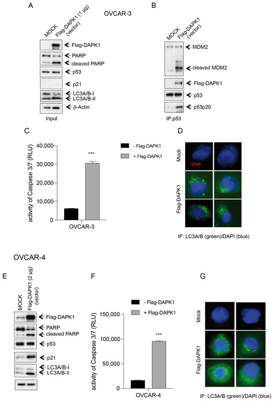 DAPK1 expression induces MDM2 cleavage in OVCAR-3 cells and phosphorylates p53 at Ser-20. (A) Lysates of cells transfected with 1 μg of a full-length DAPK1-expressing vector were subjected to SDS-PAGE and stained using antibodies for Flag, PARP, p53, p21, LC3A/B-I, LC3A/B-II, and β-Actin. (B) The lysates were subjected to IP using p53-specific antibodies, followed by Western blotting with antibodies for MDM2, Flag, p53, and p53pS20. (C) A Caspase-Glo 3/7 assay was used to measure the Caspase-3/7 activity of OVCAR-3 cells transfected with a recombinant DAPK1-expressing vector shown in (A). p < 0.001 for ***. Student’s two-tailed, unpaired t-test. (D) Representative immunofluorescence images showing the morphology of LC3-positive structures after the expression of exogenous Flag-DAPK in the HGSOC OVCAR-3 cell line (green: LC3-positive structures, blue: DNA stained with DAPI). Scale bar = 10 µm. (E) DAPK1 expression increases p21 levels and apoptosis in OVCAR-4 cells. Lysates of the cells transfected with 2 μg of a full-length DAPK1-expressing vector were subjected to an SDS-PAGE and stained using antibodies for Flag, PARP, p53, p21, LC3A/B-I, LC3A/B-II, and β-Actin. The exogenous expression of Flag-DAPK1 led to an increase in the cytoplasmic LC3-II levels, suggesting enhanced autophagy. (F) A Caspase-Glo 3/7 assay was used to measure the Caspase-3/7 activity of OVCAR-4 cells transfected with a recombinant DAPK1-expressing vector. p < 0.001 for ***. Student’s two-tailed, unpaired t-test. (G) Representative immunofluorescence images showing the morphology of LC3-positive structures after the expression of exogenous Flag-DAPK in the HGSOC OVCAR-4 cell line (green: LC3-positive structures, blue: DNA stained with DAPI). Scale bar = 10 µm. (The uncropped blots are shown in Figure S8).
