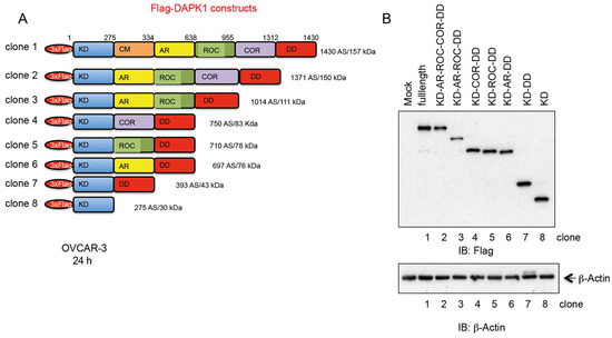 A series of truncated DAPK1 clones was tested for its apoptosis-inducing potential in ovarian cancer cells. (A) The DAPK1 functional domains, the kinase domain (KD), the Ca2+/CaM autoregulatory domain (CM), the ankyrin repeats (AR), the Ras of complex protein (ROC)—C-terminal of ROC (COR) domain, and the death domain (DD) are shown. (B) SDS-PAGE was used to separate full-length DAPK and its deletion clones 2–8, as depicted in (A). (The uncropped blots are shown in Figure S9).