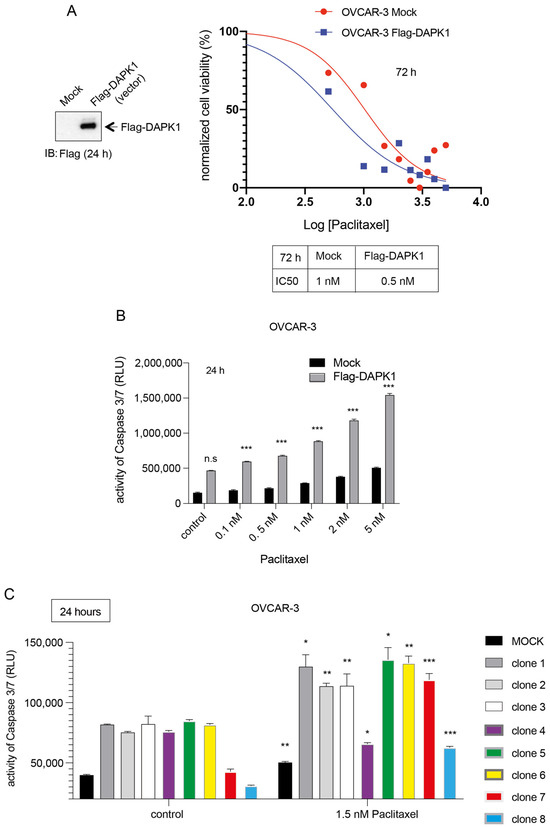 Effects of truncated DAPK1 clone expression on the survival of OVCAR-3 cells. (A) Lysates of mock-treated OVCAR-3 cells and OVCAR-3 cells transfected with a full-length DAPK1-expressing vector were subjected to SDS-PAGE and stained using antibodies for Flag-DAPK1. Cells were treated with increasing concentrations of Paclitaxel, and their proliferation was measured using a CellTiter-Blue Cell Viability assay over 72 h, with measurements taken at 72 h. The proliferation rates of the treated cells, an indicator of cell viability, were normalized against their respective DMSO-treated counterparts (vehicle control = 0 on the x-axis) and subsequently used to calculate the IC50 values for each cell type. The plots represent the IC50 values at the 72 h time point. (B) A Caspase-Glo 3/7 assay was used to analyze OVCAR-3 cells expressing a vector-based Flag-tagged full-length DAPK1 fusion protein upon treatment with increasing doses of Paclitaxel. p < 0.001 for ***. Student’s two-tailed, unpaired t-test. (C) A Caspase-Glo 3/7 assay was used to study OVCAR-3 cells (untreated, 1.5 nM Paclitaxel-treated) that were mock-transfected or transfected with DAPK1 subclone (1–8)-expressing vectors. p < 0.05 for *, p < 0.01 for **, and p < 0.001 for ***. Student’s two-tailed, unpaired t-test.