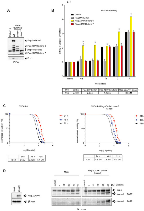 Impact of stably transfected truncated forms of DAPK1 (∆DAPK1 clone 6 and ∆DAPK1 clone 7) on the survival of HGSOC cells under Paclitaxel treatment. (A) OVCAR-8 cells stably transfected with a vector expressing full-length DAPK1 or ∆DAPK1 clone 6, or ∆DAPK1 clone 7, were treated with increasing concentrations of Paclitaxel. Lysates of stably expressing cells were subjected to an SDS-PAGE and stained using antibodies for Flag-DAPK1 and PLK1. (B) A Caspase-Glo 3/7 assay was used to study OVCAR-8 cells, stably expressing full-length DAPK1 wt or ΔDAPK1/clone 6 or ΔDAPK1/clone 7, treated with increasing doses of Paclitaxel. p < 0.01 for **. Student’s two-tailed, unpaired t-test. The plots represent the IC50 values at 24 h. (C) Sensitivity of stably transfected OVCAR-8 cells expressing truncated DAPK1 (∆DAPK1 clone 6) under Cisplatin treatment. OVCAR-8 cells (mock-transfected) and OVCAR-8 cells transfected with ∆DAPK1 (clone 6) were treated with increasing concentrations of Cisplatin, and their proliferation was measured using a Cell Titer-Blue Cell Viability assay throughout 72 h, with measurements taken at 24 h, 48 h, and 72 h. The proliferation rates of the treated cells, an indicator of cell viability, were normalized against their respective DMSO-treated counterparts (vehicle control = 0 on the x-axis) and subsequently used to calculate the IC50 values for each cell type. The plots represent the IC50 values at different time points. (D) Using Flag-DAPK1, PARP, and β-actin antibodies, cell lysates were subjected to Western blot analysis. (The uncropped blots are shown in Figure S10).