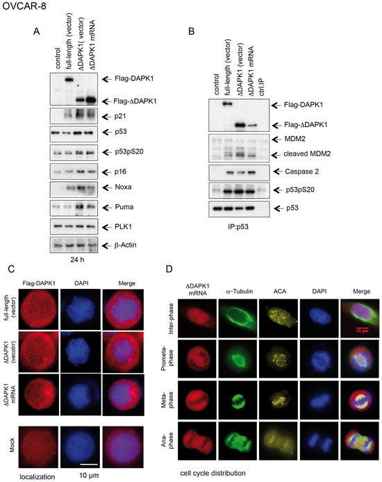 Impact of reactivation of DAPK1 functions in HGSOC cell lines by ΔDAPK1-IVT mRNA or by vector-based expression of full-length DAPK1 on p53 signaling and apoptosis. (A) Using Flag, p21, p53, p53pS20, p16, Noxa, Puma, PLK1, p14ARF, and β-Actin antibodies, cell lysates were subjected to WB. (B) An immunoprecipitation with p53-specific antibodies based on cell lysates shown in (A) was submitted to WB using Flag, MDM2, cleaved MDM2, Caspase-2, p53pS20, and p53 antibodies. (C) Interphase localization of ∆DAPK1: OVCAR-8 cells expressing either vector-based ∆DAPK1 or transfected with ∆DAPK1-IVT mRNA were fixed and processed for immunofluorescence using Flag antibodies, with DNA stained using DAPI. Both vector-expressed ∆DAPK1 and mRNA-derived ∆DAPK1 exhibited similar cytoplasmic localization (scale bar = 10 µm). (D) Mitotic localization of ∆DAPK1: OVCAR-8 cells expressing ∆DAPK1-IVT mRNA were synchronized into mitosis using nocodazole. After washing off nocodazole, cells were released for 2 h, then fixed and processed for immunofluorescence using Flag and α-tubulin antibodies. The truncated ∆DAPK1 form was observed in the cytoplasm, associating with the mitotic spindle during early mitosis (scale bar = 10 µm). (The uncropped blots are shown in Figures S11 and S12).