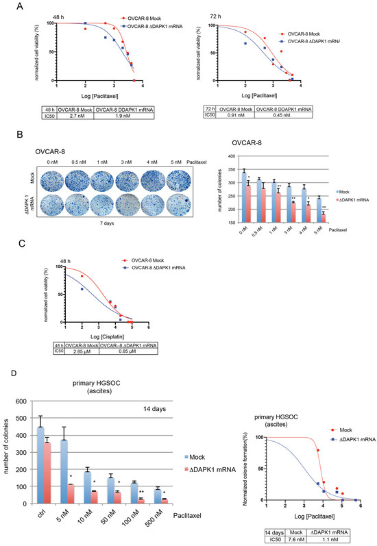 Previous experiments about the impact of vector-based expression on the response to standard therapeutics had demonstrated that the reactivation of DAPK1 sensitizes ovarian cancer cells to Paclitaxel and Cisplatin (Figure 6 and Figure 7). Next, we tested the impact of IVT ΔDAPK1-mRNA on the viability of ovarian cancer cells. The expression of the activated form of DAPK1, achieved by transfecting IVT ΔDAPK1 mRNA, significantly increased the sensitivity of OVCAR-8 cells to Paclitaxel (Figure 9A). The clonogenic assay supported the sensitizing activity of IVT ΔDAPK1-mRNA to OVCAR-8 cells treated with Paclitaxel (Figure 9B). The ability of IVT ΔDAPK1-mRNA to sensitize OVCAR-8 cells to Cisplatin treatment (Figure 9C) confirmed earlier findings observed with vector-based expression (Figure 7C,D). Furthermore, transfection with ΔDAPK1-mRNA reduced the colony-forming capacity and enhanced Paclitaxel sensitivity in primary tumor HGSOC cells derived from patient ascites (Figure 9D). Additional experiments using OVCAR-3 cells treated with Paclitaxel or Cisplatin confirmed the sensitization by the expression of ΔDAPK1 mRNA (Figure S3A,B), supporting our previous data using the vector-based expression of ΔDAPK1.