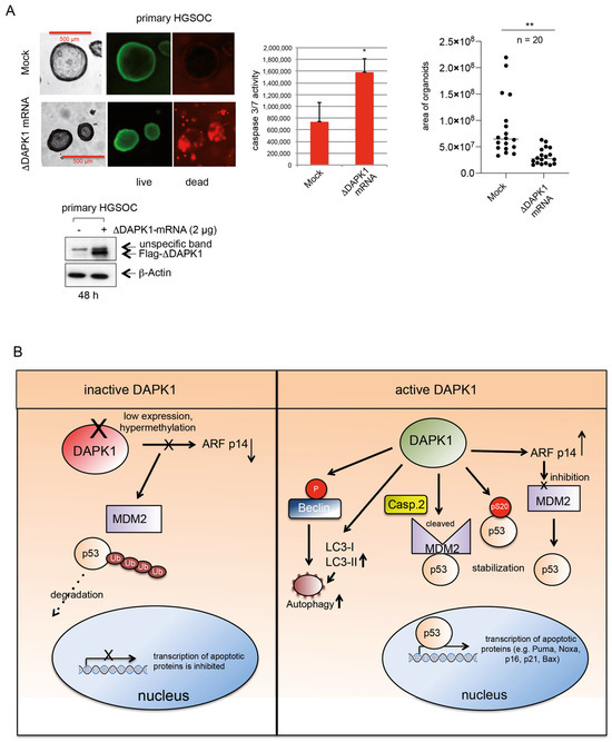 Effects of DAPK1 reactivation on the survival of primary HGSOC cells. (A) Patient-derived organoids were transfected with 2 μg of ΔDAPK1-IVT mRNA. On day 2, following transfection with 2 μg of ΔDAPK1-IVT mRNA, HGSOC organoids are depicted in representative photos (left panels), and a live/dead assay was performed. Flag and β-actin antibodies were used to perform WB on the lysates of HGSOC organoids mock or transfected with ΔDAPK1-IVT mRNA (lower left panel). The Caspase-Glo 3/7 assay was used to analyze mock- or ΔDAPK1-IVT mRNA-transfected HGSOC organoids (right panel; n = 3). * p < 0.05; unpaired, two-tailed Student’s t-test. ImageJ 1.0 was used to calculate the size of the organoids (middle panel; n = 20). ** unpaired, two-tailed Student’s t-test; p < 0.01. (B) Targeted reactivation of DAPK1 in ovarian cancer cells and resulting changes in cellular signaling. Ovarian cancer lacking DAPK1 exhibits a reduced expression of p14ARF, enabling MDM2 to stably bind to p53, resulting in its ubiquitination and degradation. This degradation impairs the transcription of p53-dependent apoptotic effectors and cell cycle regulators, promoting cancer cell proliferation and survival. In contrast, the reactivation of DAPK1 using an IVT-mRNA triggers multiple pathways that stabilize and activate p53, promoting cell cycle arrest and triggering cell death through the p53-dependent transcription of apoptosis and cell cycle effectors. Furthermore, active DAPK1 promotes Caspase-2 activation, which targets MDM2 for cleavage, thus preventing p53 degradation. Additionally, DAPK1 phosphorylates p53 at S20, further enhancing its activity. Reactivated DAPK1 also indirectly increases p14ARF expression, stabilizing p53 and facilitating the transcriptional activation of apoptosis and cell cycle regulatory genes. Finally, DAPK1 promotes the conversion of LC3A/B-I to LC3A/B-II, and both processes are crucial in inducing autophagy. Hence, the vector-based and IVT-mRNA-dependent reactivation of DAPK1 demonstrates a dual role in promoting p53 stability and autophagy, emphasizing its therapeutic potential in targeting ovarian cancer.