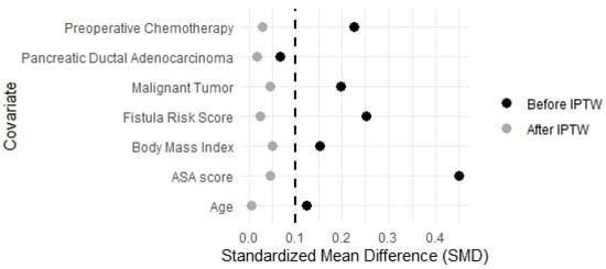 Although not statistically significant, imbalances between the open and robotic-assisted groups were observed in several variables, including ASA score, Fistula Risk Score, and the presence of biliary drainage at the time of surgery (SMD > 0.2), suggesting potential confounding factors that may bias outcome comparisons. Furthermore, a moderate imbalance (SMD > 0.1) was noted for other baseline variables (Table 1).