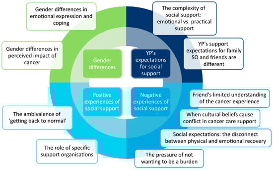 Four cross-cutting themes related to the psychosocial experiences of AYAs with cancer were identified. These interpretations provided insight into gender differences, social support expectations, and both positive and negative experiences of social support, each with several constituent sub-themes (Figure 1).