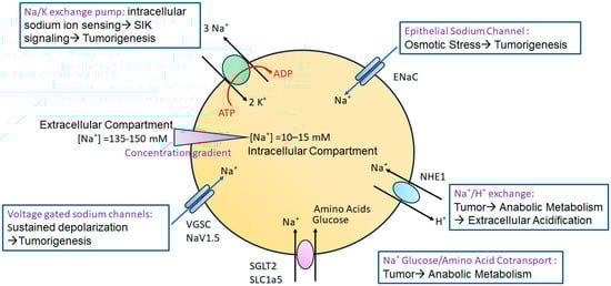 In human tissues, the extracellular (EC) fluid [Na+] is approximately ten times higher than the intracellular (IC) compartment [36]. While the sodium concentration in extracellular fluid [ECF-Na+] ranges from 135 to 145 mM, the intracellular fluid sodium concentration [ICF-Na+] is 5–15 mM [37]. This difference is actively maintained by ATP-dependent Na+/K+ pumps [38]. In general, the cell membrane resists the concentration-dependent free movement of sodium ions between the IC and EC compartments. This ten-fold ionic concentration gradient across the membrane caused by ATP-dependent active Na+/K+ exchange pumps results in the resting membrane potential [39]. This Na+/K+ ATPase consumes up to 25% of all ATP generated by the cell, and it could be as high as 70% in the brain [40]. For every ATP used by the Na+/K+ ATPase, three Na+ are pumped out of the cell while two K+ are moved into the cell. This Na+/K+ exchange pump is shown to have a higher affinity to intracellular sodium ion sensing over potassium ions [41]. Importantly, the salt-inducible kinase (SIK) is shown to modulate the Na+/K+ exchange pump [42]. An enhanced SIK expression is correlated with the downregulation of the Na+/K+ ATPase, probably resulting in increased IC [Na+] in breast tumors [43]. On the other hand, the downregulation of Na+/K+-ATPase functionality could be due to enhanced Warburg metabolism leading to decreased ATP production [44].