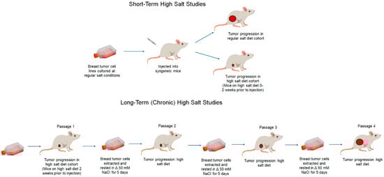 A possible reason for these apparently conflicting outcomes in tumor progression following dietary salt modulation could be due to a lack of a consensus on the duration of the HS diet needed for tumor immune editing. Further, the short-term HS diet utilized in pre-clinical models is not a realistic representation of human settings, wherein the HS diet is a long-term lifestyle adopted over a period of several years. Further, while the short-term HS diet could lead to the activation of anti-tumor effector immune responses, on the other hand, the long-term HS diet could cause immune exhaustion. To verify these potential limitations of the short-term HS diet, we have developed a novel chronic HS diet preclinical murine orthotopic tumor model (Figure 2) [74]. It is important to note the challenges of developing a chronic HS dietary preclinical murine tumor model. As per IACUC (Institutional Animal Care and Use Committee) protocols on the humane treatment of murine models, the tumors should not grow to more than 1.5 cm in diameter. Furthermore, in mice carrying a tumor burden for a prolonged amount of time (up to 6 months tumor burden), there will be unacceptable ulceration at the tumor site and inflammatory sickness. To address these experimental challenges, we have developed a novel chronic (long-term) HS dietary murine tumor model. Briefly, to generate this chronic HS diet model, we performed sequential passage of tumor cells in mice under HS dietary conditions (passage 1, P1, to passage 4, P4). The mice were placed on an HS diet (4% NaCl) for 2 weeks prior to the injection of syngeneic murine breast cancer cells and later continued through the tumor-bearing phase. The tumors from these mice (P1) were harvested on day 28, and tumor cells were collected by collagenase digestion and rested in a cell culture incubator for 5 days under high-salt culture conditions (Δ 50 mM NaCl). These high-salt-cultured P1 passaged tumor cells are injected into mice kept on a high-salt diet (as mentioned above). This process is repeated for a total of four cycles (P1 to P4). Further, immune and metabolic analysis demonstrated that the chronic HS diet induced tumor-initiating stem cells and Warburg-like glycolytic metabolism which are needed for the synthesis of anabolic metabolites for tumor cell growth and proliferation. Importantly, the analysis for tumor-infiltrating T lymphocytes in P4 tumors demonstrated enhanced expression of the immune checkpoint inhibitor CTLA4, while those in P1 demonstrated a higher frequency of the effector Th17/Th1 phenotype. These data suggest that the long-term HS diet as a lifestyle practice could be potentially deleterious to cancer patients.