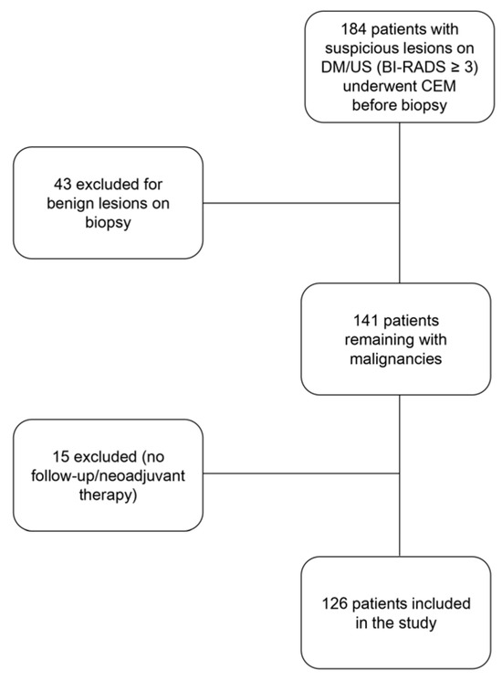 A total of 184 patients were selected to undergo CEM following the detection of a suspicious breast finding that required cytological/histological assessment. Subsequently, 58 patients were excluded (either because the histological result of the evaluation was benign, because they underwent neoadjuvant chemotherapy, or because follow-up data could not be retrieved). The study flowchart is shown in Figure 2.