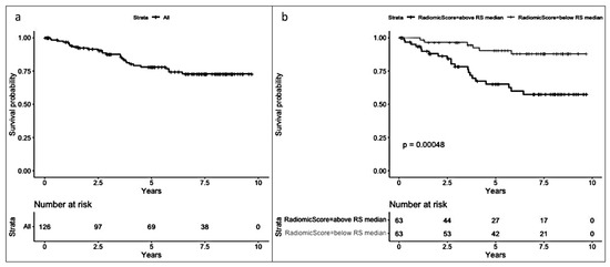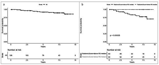 In the radiomic model (Figure 5), a significant difference (p < 0.001) was observed between patients with an RS below the median and those with an RS above the median (median RS = −0.91), favoring a better prognosis for patients with an RS below the median.