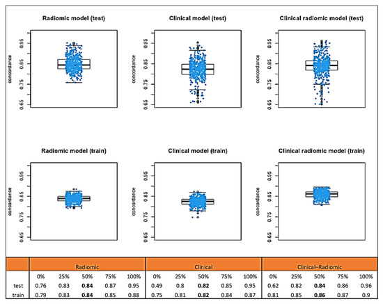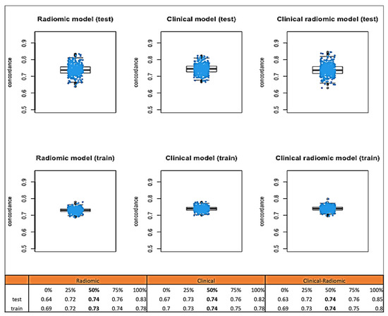 Median C-index values obtained through bootstrap testing demonstrated a good fit of the model to the data (Figure 4): the clinical model had a median test C index of 0.82 (IQR: 0.80–0.85), while the test C index of the clinical–radiomic model was slightly higher, at 0.84 (IQR 0.82–0.86).