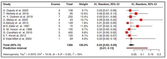 A total of 10 studies were included in the analysis, comprising 1386 recorded cases of NF-1 patients [53,54,55,56,57,58,60,61,62,63]. The analysis for the pooled estimate of the proportion of small intestinal GIST cases among the total NF-1 patient population per study was based on random-effects models and the inverse variance method after logarithmic transformation. The pooled proportion estimate is 0.03 with a 95% confidence interval (0.02–0.05). The values for each study are presented in Table 3 and are graphically represented in the forest plot (Figure 5), along with the pooled estimate and heterogeneity indices. The heterogeneity test among studies presented in Figure 6 showed an I2 value of 54%, which is statistically significant with p = 0.02. The assessment for publication bias using the funnel plot indicates symmetry (Figure 6), supporting the conclusion that there is no significant impact from the selection of the included studies on the results.